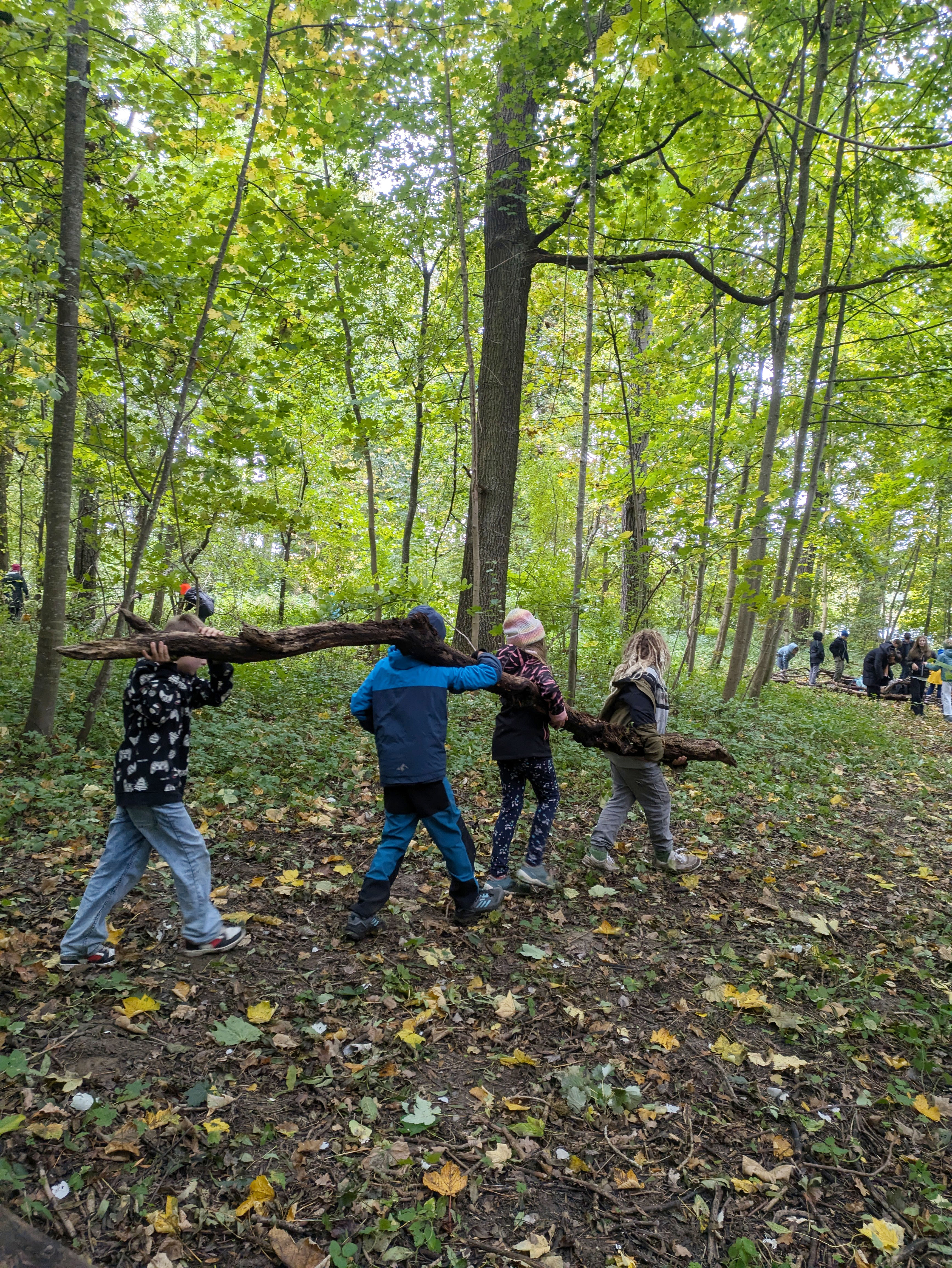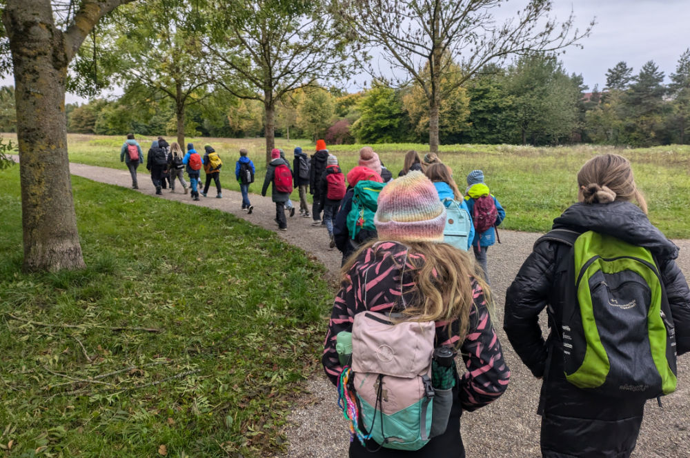 Angela Schmidt aus dem Team der Umweltstation begleitete die Schüler:innen dann auf einen Spaziergang. Dabei gab es immer wieder Stopps mit Teamspieleinheiten: eine hervorragende Gelegenheit, um auch den Klassenverbund noch einmal zu stärken. So durften die Kinder zusammen einen Waldcode knacken, einen Flaschengeist bändigen und einen Zaubertrank für die Lehrerinnen retten.