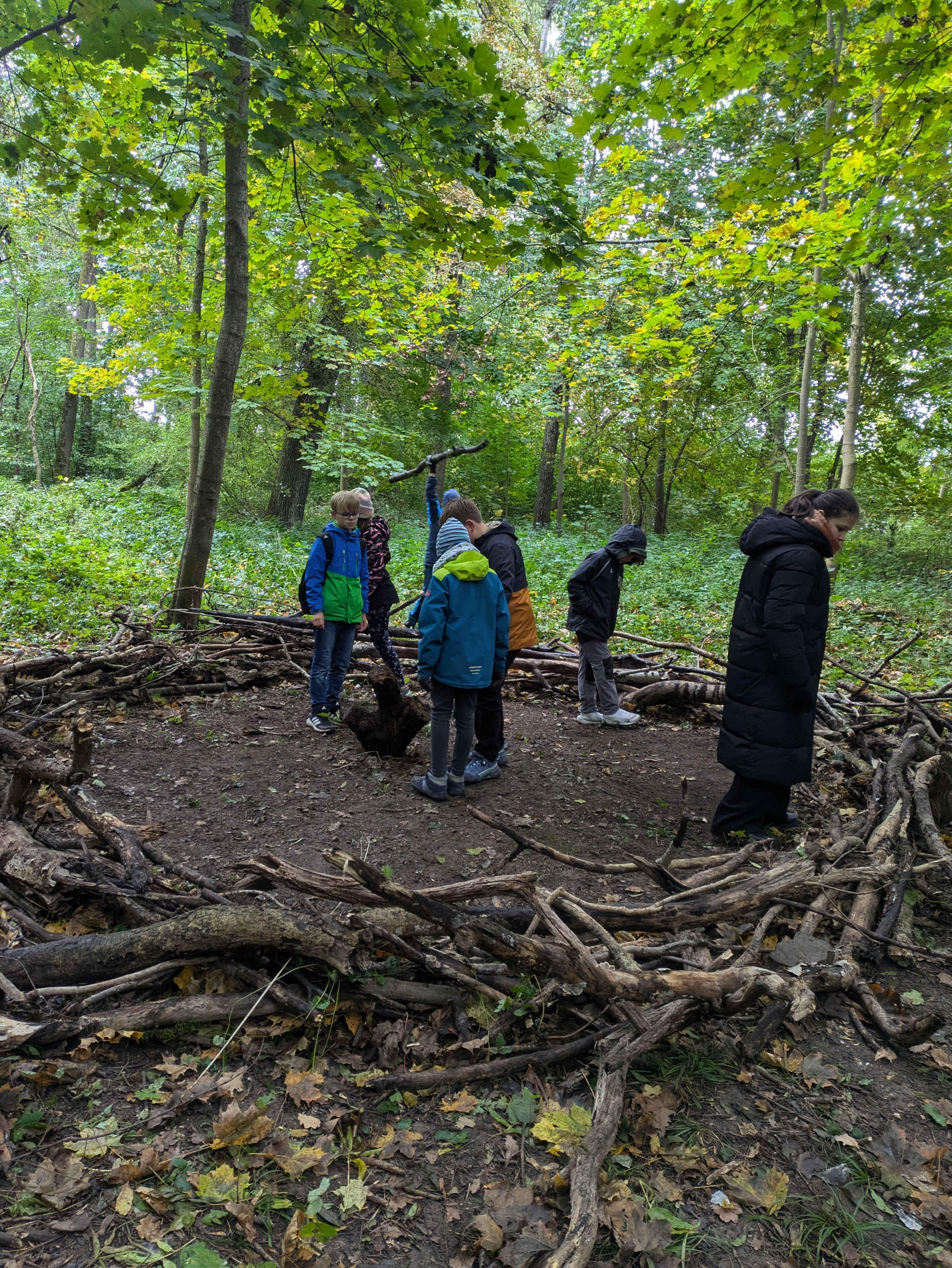 Der Höhepunkt war dann erreicht, als die Kinder in einem Waldstück Äste für ein Riesen-Nest sammeln durften. Alle halfen zusammen und so entstand innerhalb kurzer Zeit ein Kreis aus Ästen, in dem die ganze Klasse Platz fand und das von Seiten des Umweltstationsteams als “bisher schönstes gebautes Nest” besonders gelobt wurde.