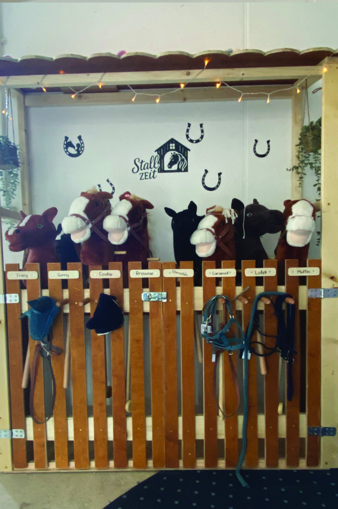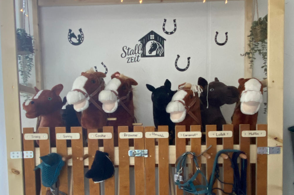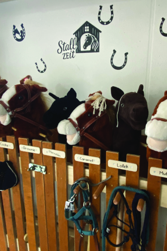 Vom Erlös des letzten Weihnachtsmarktes konnten mehrere neue Steckenpferde angeschafft werden. Damit das Reiterlebnis perfekt ist, wurde auch an das passende Zubehör wie Halfter gedacht.
