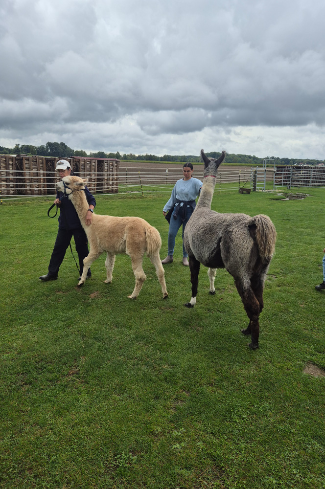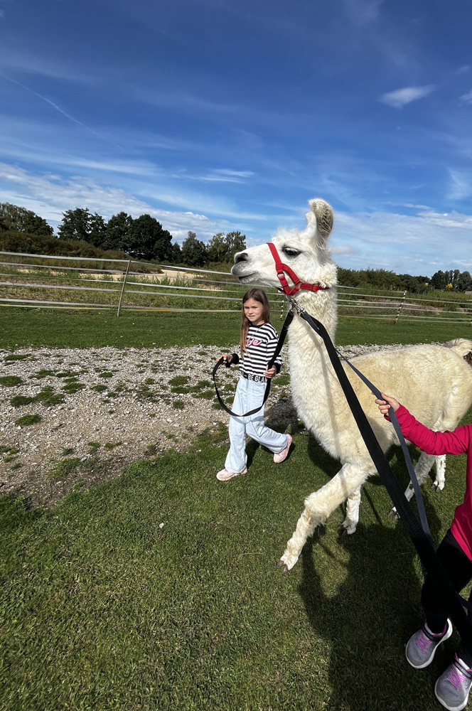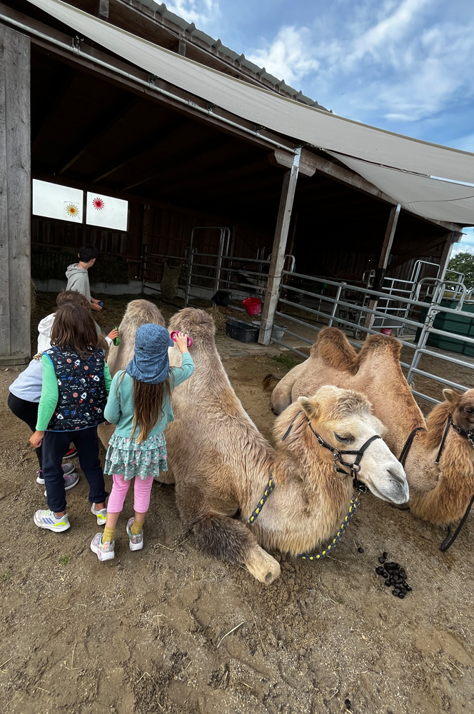 Nach einer freundlichen Begrüßung wurden die Kinder in drei Gruppen aufgeteilt, um verschiedene Stationen auszuprobieren. In der Alpaka-Station bemalten sie Holzmedaillen, die sie später stolz mit nach Hause nahmen. In der Lama-Station führten die Kinder zu zweit ein Lama oder ein Alpaka durch einen Parcours und konnten dabei Teamgeist und Geduld zeigen. Besonders aufregend war die Trampeltier-Station: Hier wurden die Tiere gestriegelt und die berühmten Höcker gestreichelt, die sich ganz besonders anfühlten.