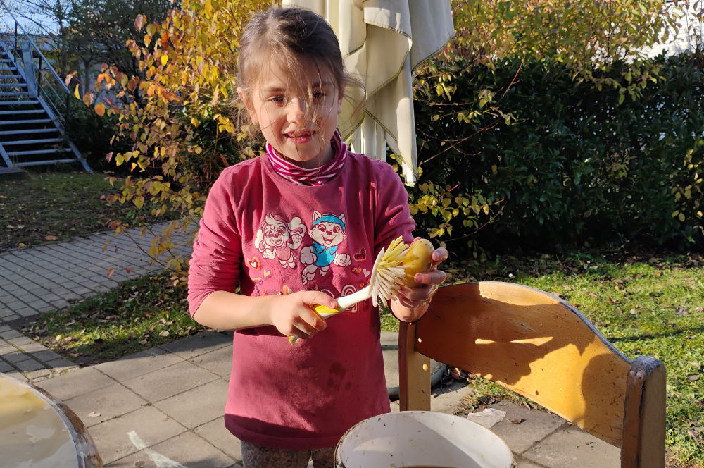 Mit mehreren vollen Eimern ging es müde, aber glücklich zurück in den Schulkindergarten bzw. Hort. Dort wurde dann fleißig geschrubbt und gewaschen, um die Kartoffeln von der Erde zu befreien.