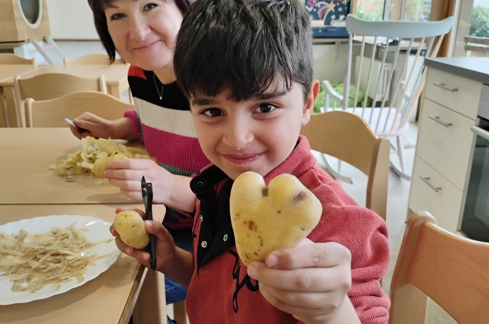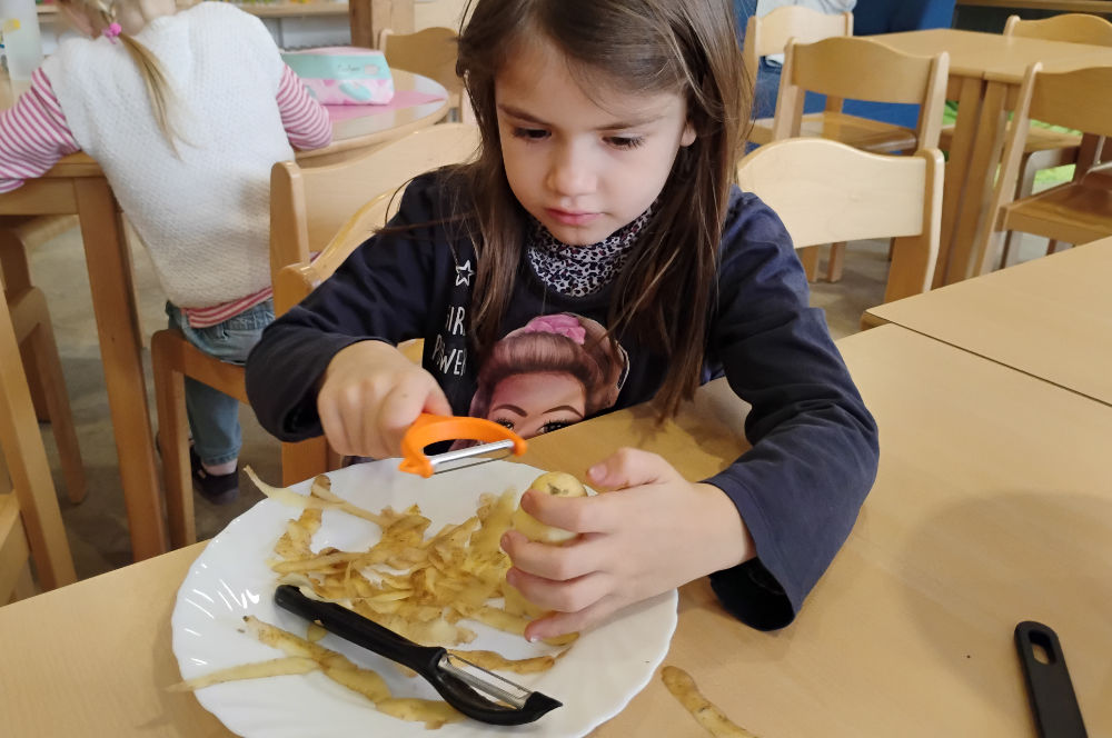 Am nächsten Tag stand die gemeinsame Zubereitung einer leckeren und gesunden Kartoffelsuppe auf dem Programm. Beim Schälen und Schneiden waren alle Kinderhände gefragt und gemeinsam wurde der Kochlöffel geschwungen. Das Fazit der Kinder lautete: "Selbstgemacht schmeckt es einfach am besten!"