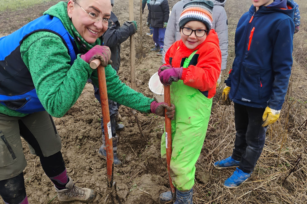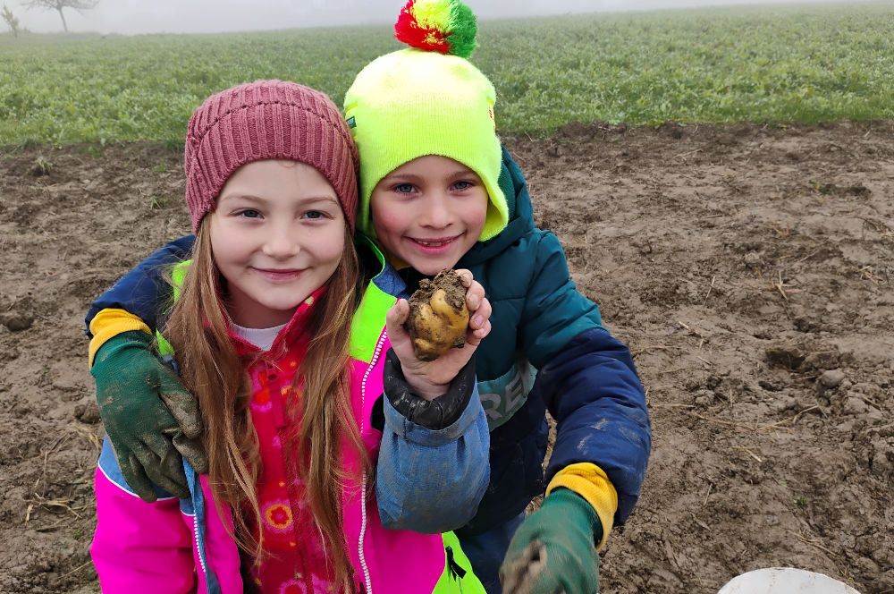 Dort warteten noch unzählige Kartoffeln darauf, aus der Erde geholt zu werden. Die Kinder waren mit Feuereifer dabei, die Erde umzugraben und sich auf die Suche zu begeben. Die Freude war groß, egal ob große oder kleine Kartoffeln gefunden wurden. Neben den Kartoffeln gab es noch viele kleine Lebewesen zu entdecken, die genau unter die Lupe genommen wurden.