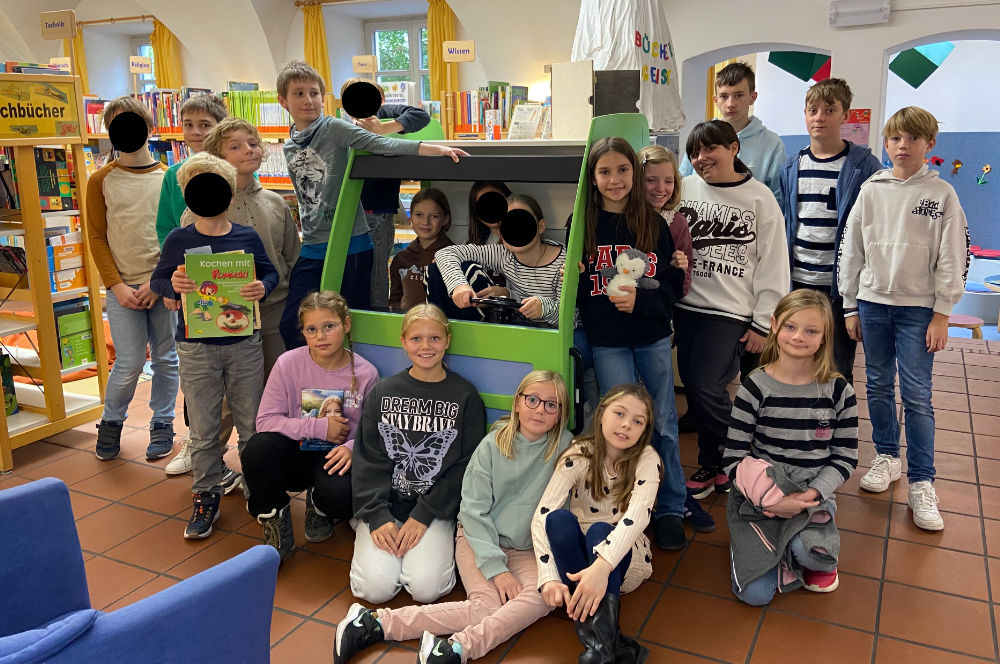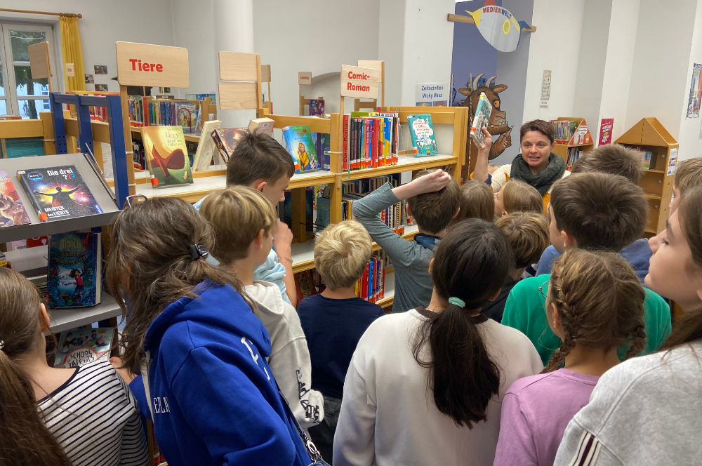 Zunächst bekamen die Kinder eine kleine Führung durch die Kinder- und Jugendbuchabteilung. Hier lernten sie, wo sie Romane, Sachbücher und Comics finden können.