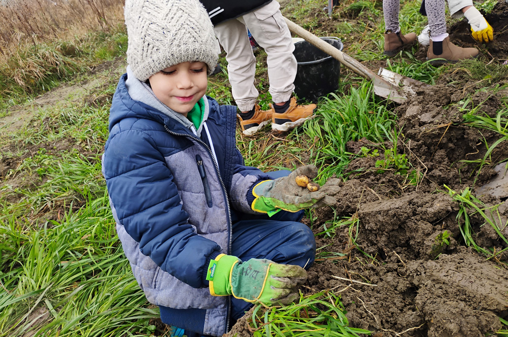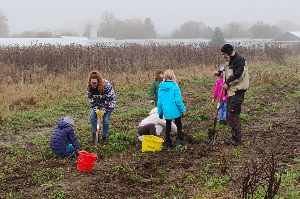 Anna und Thomas, die das Gemüsefeld bereits seit einigen Jahren bewirtschaften, erwarteten die Feriengruppe bereits gespannt. Nach einer kurzen Einführung ging es auch schon los. Ausgestattet mit Gartenhandschuhen, Eimern und Spaten marschierten die Kinder auf das Feld. An diesem Tag stand die Kartoffelernte an. "Und was gibt es Schöneres zu tun, als in der Erde zu buddeln, nach Kartoffeln zu suchen und dabei noch die Regenwürmer bei ihrer Arbeit zu beobachten?" findet Michaela Adlkofer, die unter anderem das Angebot der Ferienbetreuung leitet. Die Kinder hatten große Freude, sich als Kartoffelbäuer:innen zu betätigen und die unzähligen Kartoffeln aus der Erde zu holen. Und dabei war es ganz egal, ob die Kartoffeln groß, klein oder etwas unförmig waren. Alle Kartoffeln landeten im Eimer.