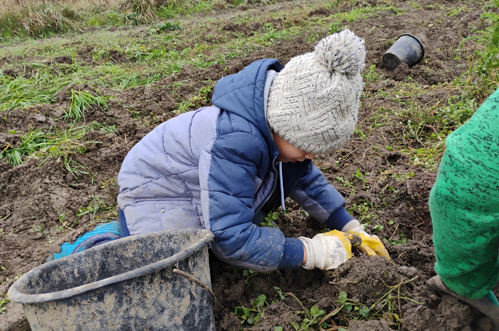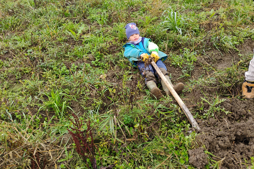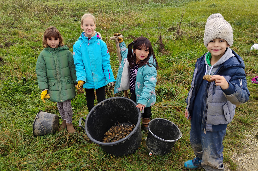 Und in den Herbstferien gab es noch genügend Arbeit auf dem Gemüsefeld. Und dieses Mal war es ein ganz besonderer Einsatz: Kinder aus dem Schulkindergarten, dem Integrationshort, der Mittagsbetreuung und der Sekundarstufe waren gemeinsam auf dem Feld aktiv.