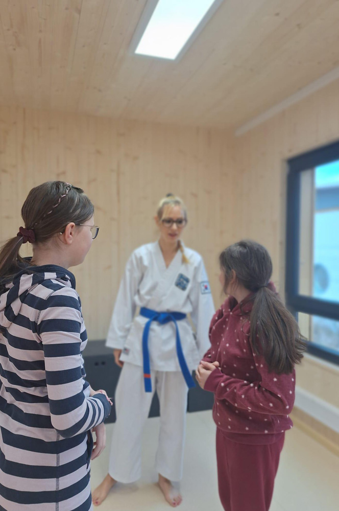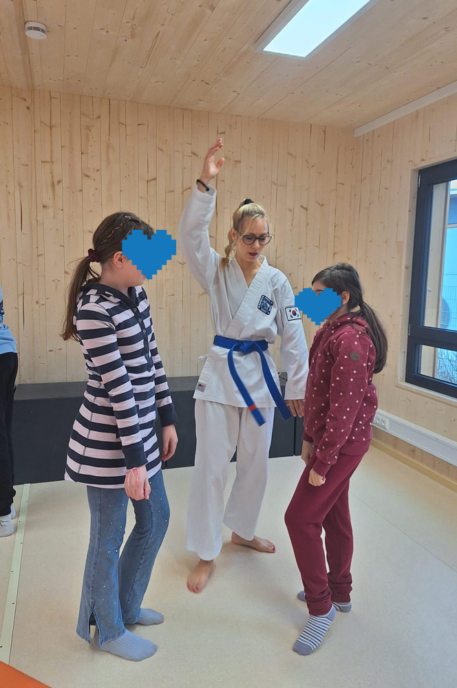 Ilona Lechner, Trainerin und Schwarzgurt (1.DAN) von der Taekwondo Schule Geisenfeld kommt für diese Trainingseinheiten extra an die Montessorischule. Zusammen mit Pädagogin Sandra Taubmann zeigt sie den Mädchen der 5. bis 8. Klasse ein paar einfache Techniken für den Alltag. “Uns geht es hierbei hauptsächlich darum, dass sich die Mädchen in Notsituation wehren können und dass sie auch gestärkt in mögliche Konflikte reingehen”, erklärt Sandra Taubmann, die selbst leidenschaftliche Kampfsportlerin ist.